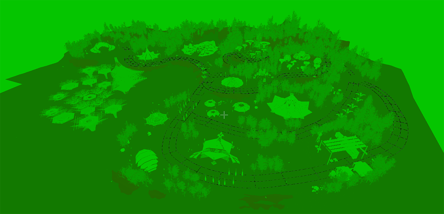HNZLR led the creation of a richly detailed open-world festival environment: he sculpted and painted terrain, instanced layers of lush meadow foliage, created paths, carefully placed Do Lab’s iconic structures, designed sightlines, curated ambient life. He authored visual moments throughout, such as parked Kubotas, picnics, yoga gatherings, beach scenes, lake floaties, butterflies, art easels, belle tents, and more. These broad gestures and granular details evoke the living heartbeat of the festival.